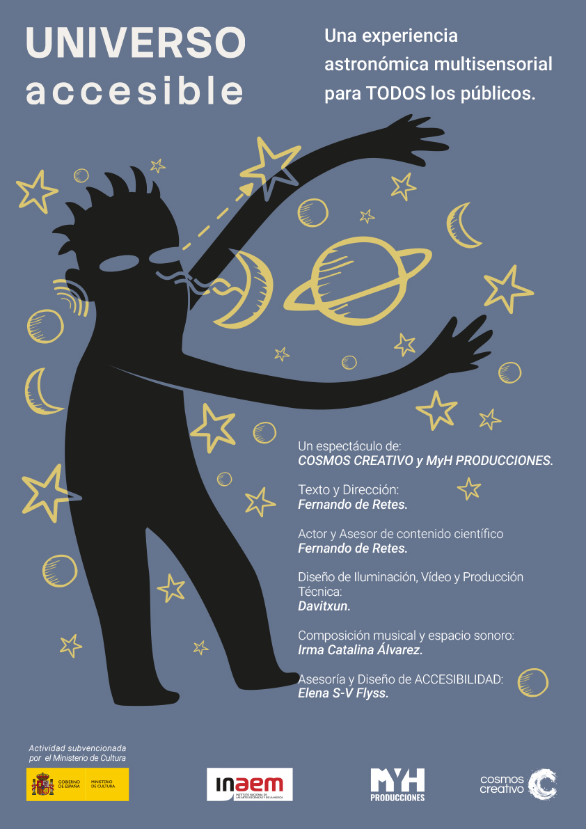 Con una dramaturgia original de Fernando de Retes, Universo accesible propone un viaje por el universo a través de los sentidos. El uso de iluminación, sonido, elementos olfativos y táctiles permitirá a todos los públicos experimentar el cosmos como nunca antes, y hacerlo de forma accesible.